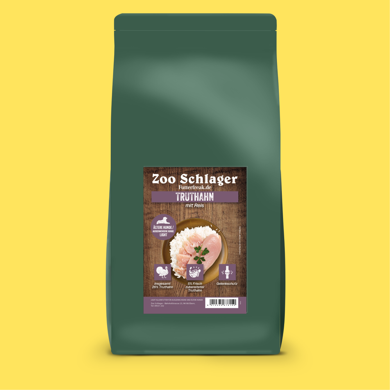Truthahn mit Reis wurde speziell für ältere Hunde sowie für ausgewachsene Hunde entwickelt, die eine kalorienreduzierte Ernährung zur Gewichtskontrolle benötigen.