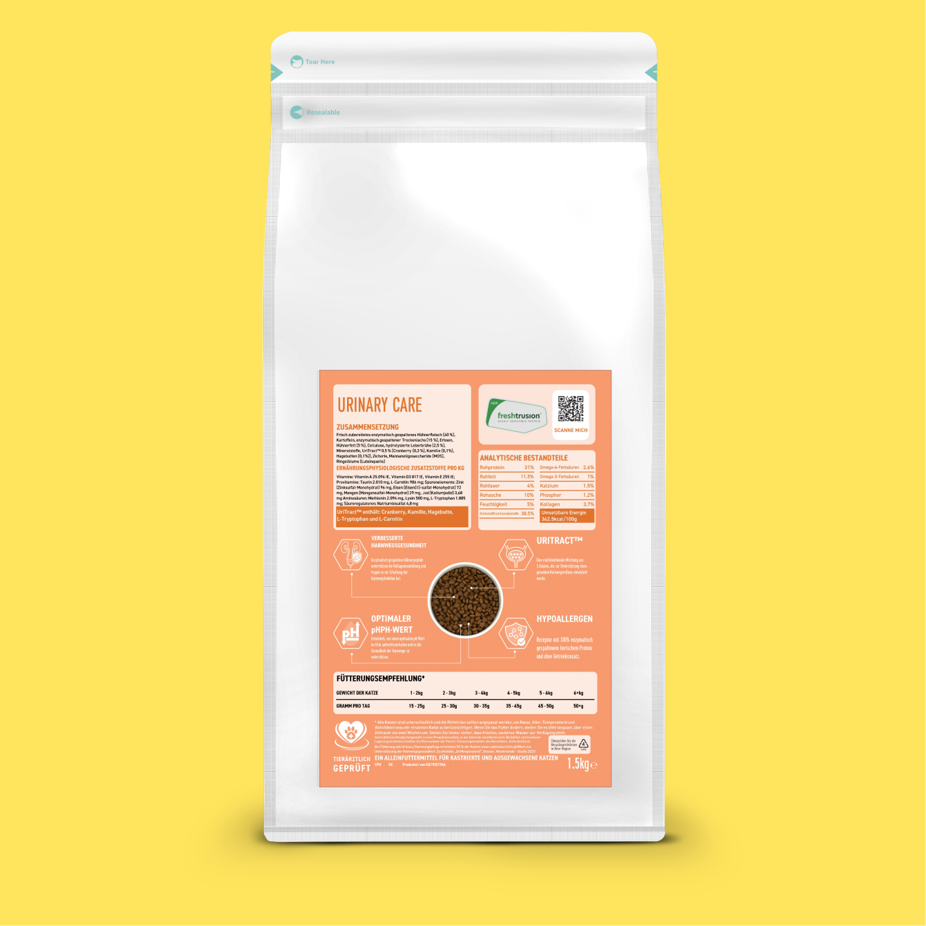 Gezielte Premiumernährung für sterilisierte und erwachsene Katzen. Mit enzymatisch gespaltenem Hühnerprotein, schützenden Kollagenpeptiden und der UriTract™-Mischung zur Förderung eines optimalen Urin-pH-Werts, zur Stressregulation und zur langfristigen Stärkung des Harnwegssystems.